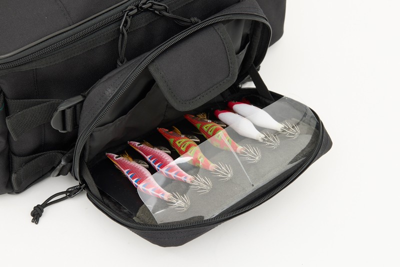 対面6段ラックにより、3号と4号のエギを合計30本個別収納できるエギングバッグ。