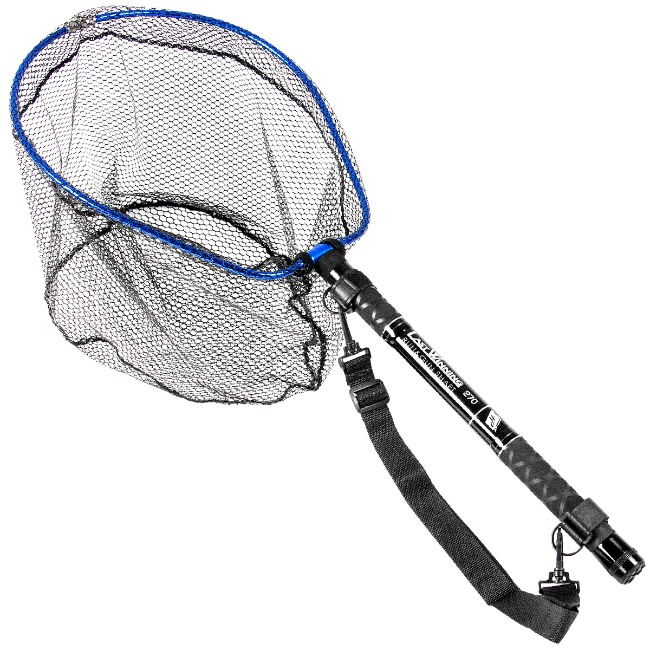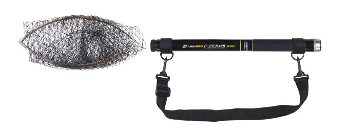 4つ折りタイプの磯玉網がセットで、着脱しやすいベルクロ式ショルダーベルト(最大長約1m)とあいまって持ち運びや保管が楽々。