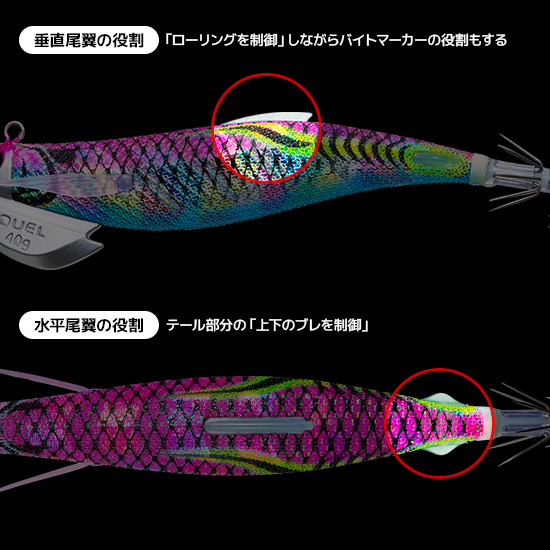 表面積を増やしたボディで直進安定性を高めており、極端な浮き上がりを抑えてイカに長く見せられます。