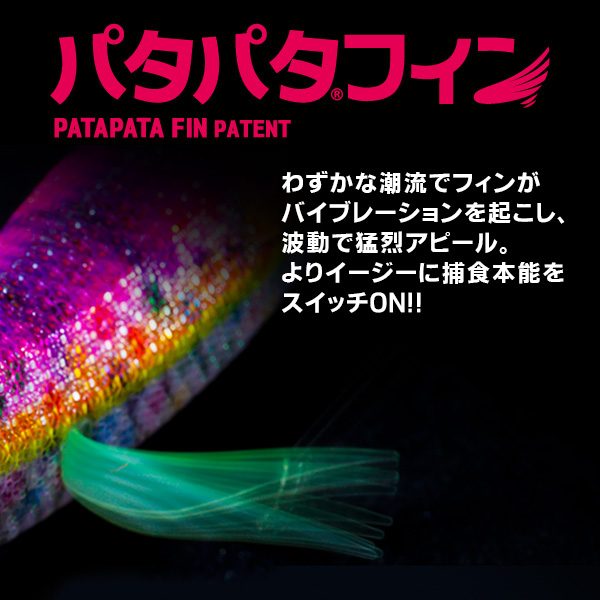 わずかな潮流でフィンがバイブレーションを起こす「パタパタフィン」と、瞬間的に大きくフラッシングする多面体ボディでイカに強烈アピール。